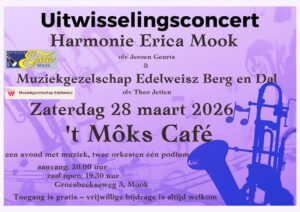 Op zaterdag 28 maart 2026 om 20:00 spelen we een uitwisselingsconcert met muziekgezelschap Edelweisz uit Berg en Dal in ’t Môks Café in Mook.